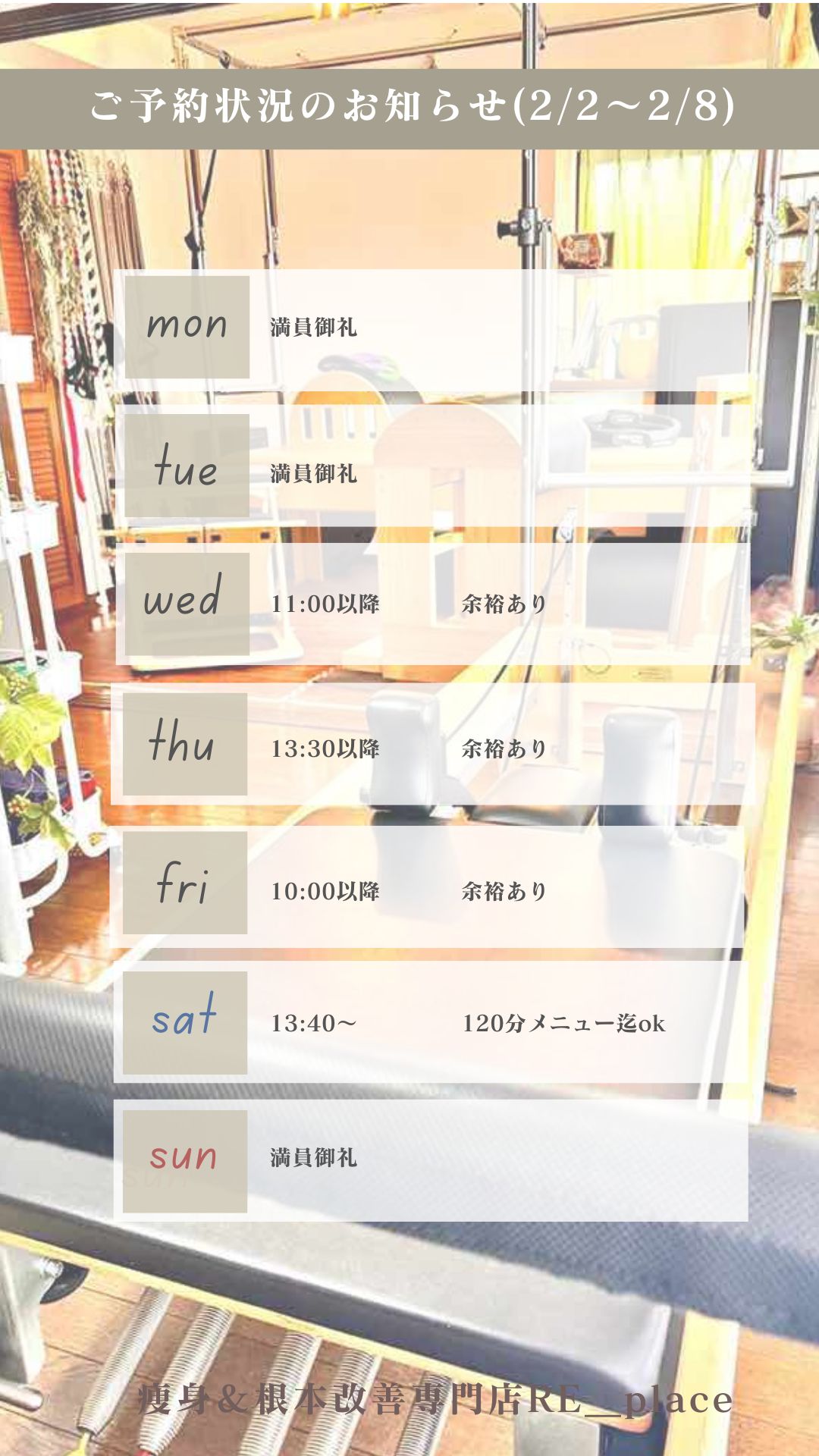 2026.2.2 お知らせ 今週のご予約状況のお知らせ(2/2-2/8) 今月はいたばしペイでのお支払いで【20%還元】のチャンス♪ 板橋区民以外の方もご利用可能です◎ お気軽にご利用ください^^ 痩身&根本改善専門店RE_place https://lin.ee/pa1bID4 BACK ALL NEXT