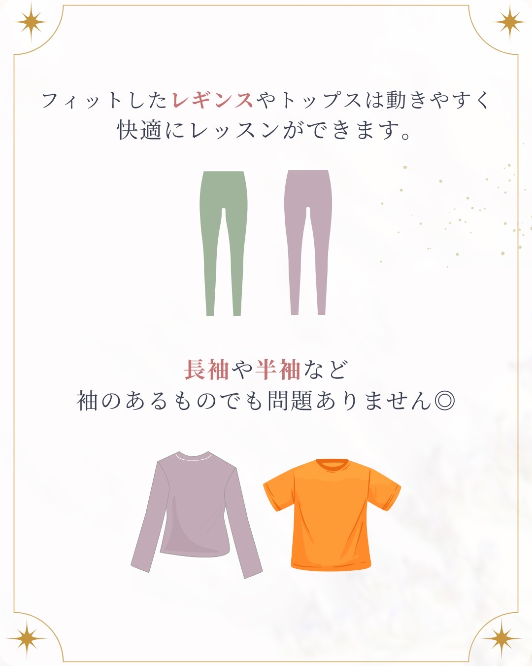 レギンスやフィット感のあるトップスがオススメですが