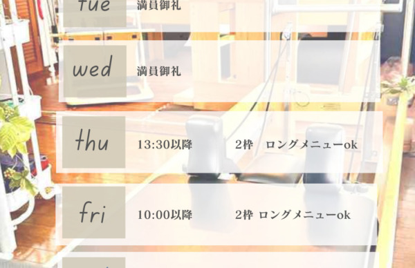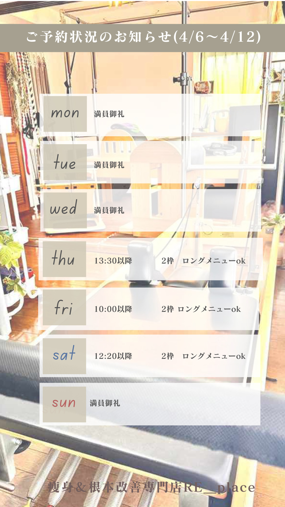 2026.4.5 お知らせ 【今週の空き状況 4/6〜4/12】 【今週の空き状況 4/6〜4/12】 こんにちはRE_placeです。 いつもご利用ありがとうございます。 4月の土曜日はお陰様でご予約が埋まっており 11日 12:20以降 120分メニュー迄 のみ、ご予約をお取りすることが可能です。 日曜、平日夜もご予約が取りづらくなっております。 ご予定がわかるお客様はお早めのご予約をおすすめいたします🙇♀️ 痩身&根本改善専門店RE_place https://lin.ee/pa1bID4 BACK ALL