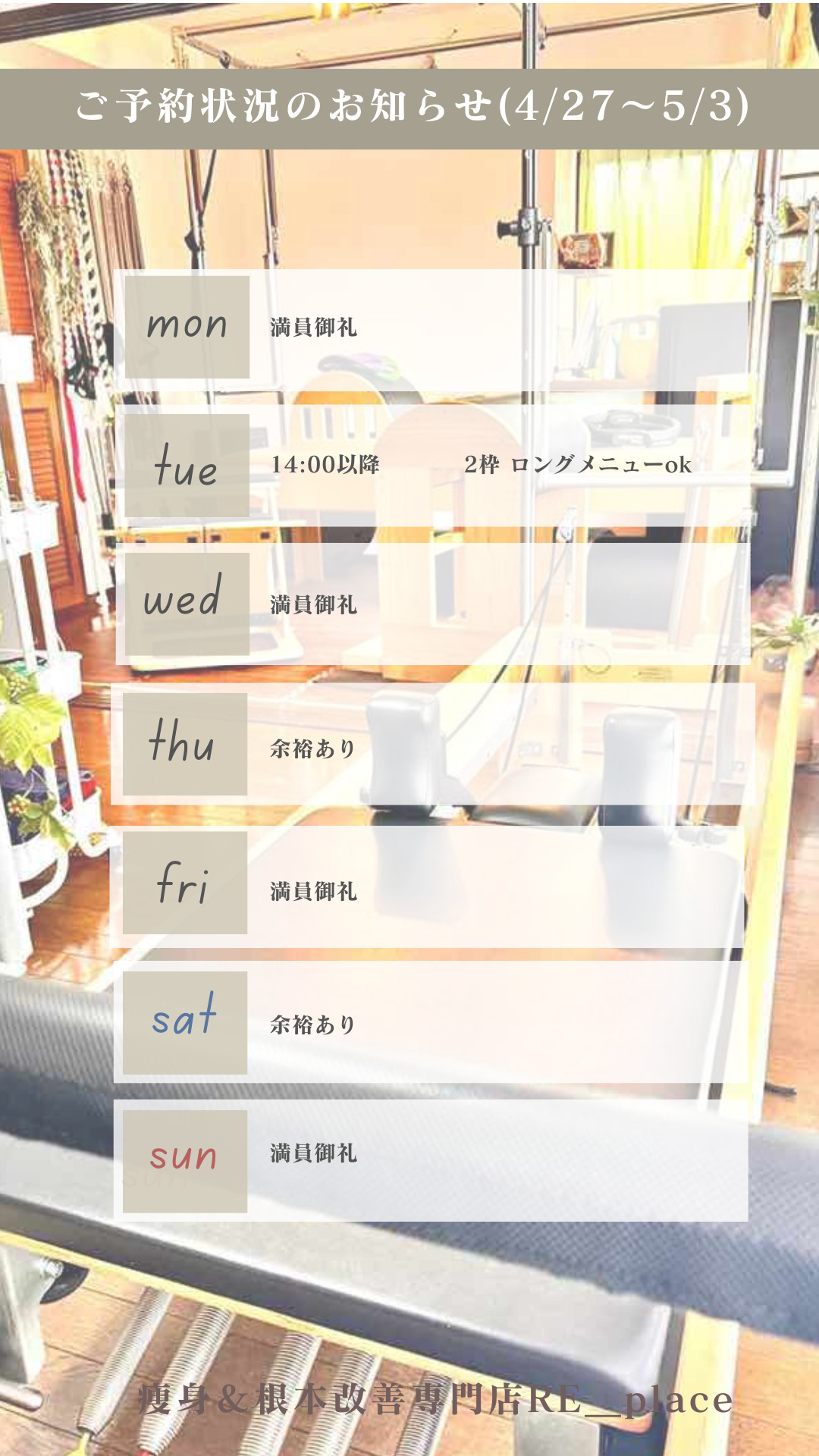 2026.4.27 お知らせ 【今週の予約状況 4/27-5/3】 【今週の空き状況4/27-5/3】 夜のご案内枠は満席となっております。 30日木曜と1日土曜日はまだお時間に余裕がございます🌿 痩身&根本改善専門店RE_place https://lin.ee/pa1bID4 BACK ALL